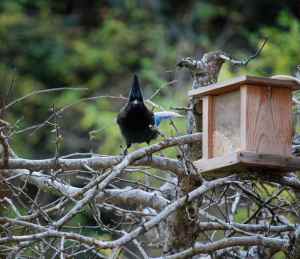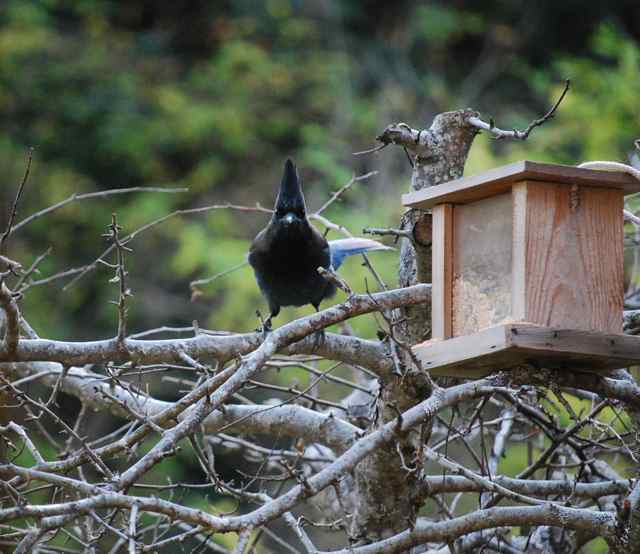 This afternoon, after a particularly insightful but lengthy day of supervisory training, I plopped my weary self down at my kitchen table and watched a pair of Steller’s Jays stuffing themselves at the feeder I set out a few days earlier. Thus far, a pair of Juncos have tentatively approached the feeder and determined it safe enough to bring junior in for a few visits. Far and away, however, the jays are reaping the benefits of the bounty. The presence of food does not appear sufficient for even the least of the two, which has made several attempts with its beak to procure the mother load behind the plastic exterior.