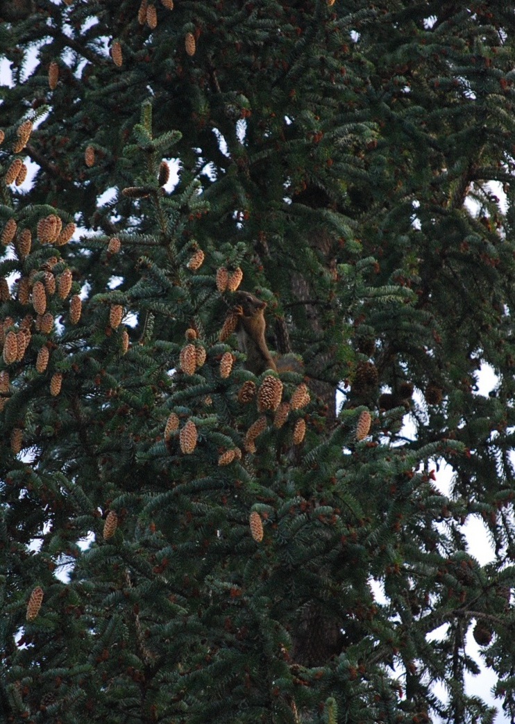 Well, I did what any detective might do in a similar situation. I determined that these sounds were originating from a single spot. When I trained my binoculars on this spot, a Red squirrel was looking directly at me. It had paused its activity to determine the level of threat I represented, along with whether I warranted further attention and/or closer inspection that would detract from its busy schedule of hurling Western hemlock cones down to the moss-covered ground.