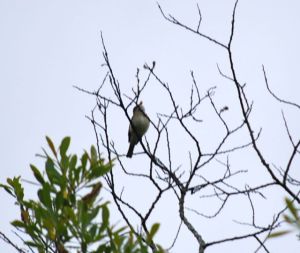 Now, having heard the wee fellow, I had two choices. Remain in the warmth of the car and head home or get out and try to get a good look at it. I chose the latter. If you flip through a field guide to birds, you will see that the flycatcher family is one that could be considered the bane of a birder. Each bird appears a shade of olive green-yellow with slight eye ring and tendency toward tail flicking. Without hearing the call or song, even the most dedicated, seasoned birder will err on the side of caution before offering a definitive id.