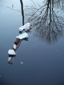 There was something quite mesmerizing about those paper cups and plastic bottles dancing in the current, now spinning alone, now waltzing with an oak leaf leftover from the fall. In their positions side by side, they were a literal metaphor, a juxtaposition of the ecological and social worlds. We can dance in rhythm with the natural systems on this planet or we can make attempts at a solo.