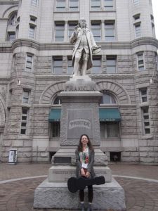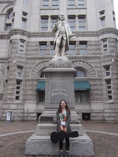 And nervous. After taking the elevator up for a unique birds-eye view of D.C., I promptly went outside, sat on a bench, and took out my uke to practice. I took one quick moment to have a fellow participant in the training take my photograph in front of a Benjamin Franklin statue.