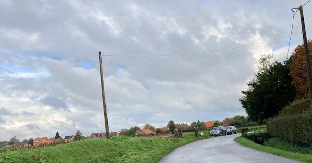 We had not gone far when we saw two men in dark olive green, replete with rifles and a breed of spaniel, get out from a car parked on the side of the road and begin walking into the farm field.