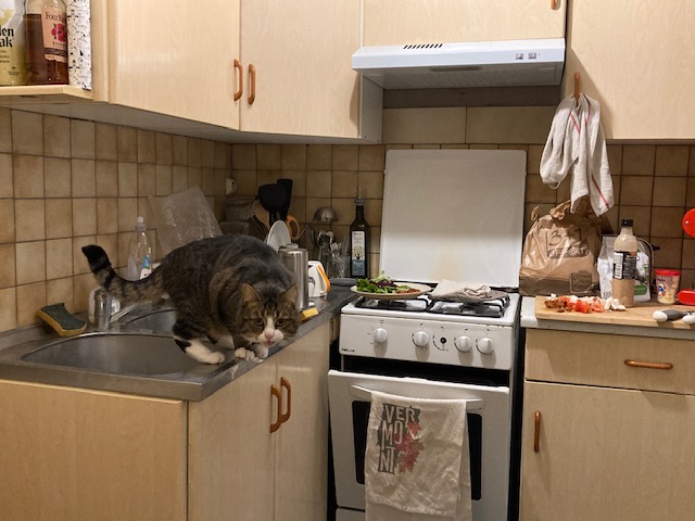 Metric kitchen and wild Belgian backyard cat, becoming a bit of a feline daredevil