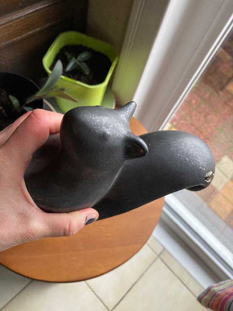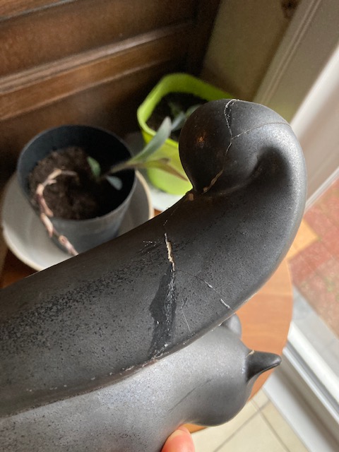 My husband smelled something burning and though we should move the dry rack that we keep posted around the pellet stove and use as a dryer since our current home does not have one. I through I should move the couch in order to move the dry rack a bit further from the stove. Rather than taking the time to move the little “side table,” which is a ramshackle, makeshift creation from three typewriters in their cases, one stacked on top of another, I went ahead and moved the couch. In the process, I managed to save the scarf from spontaneous combustion but also knocked my favorite little piece of pottery off of the, smashing it into three pieces.
