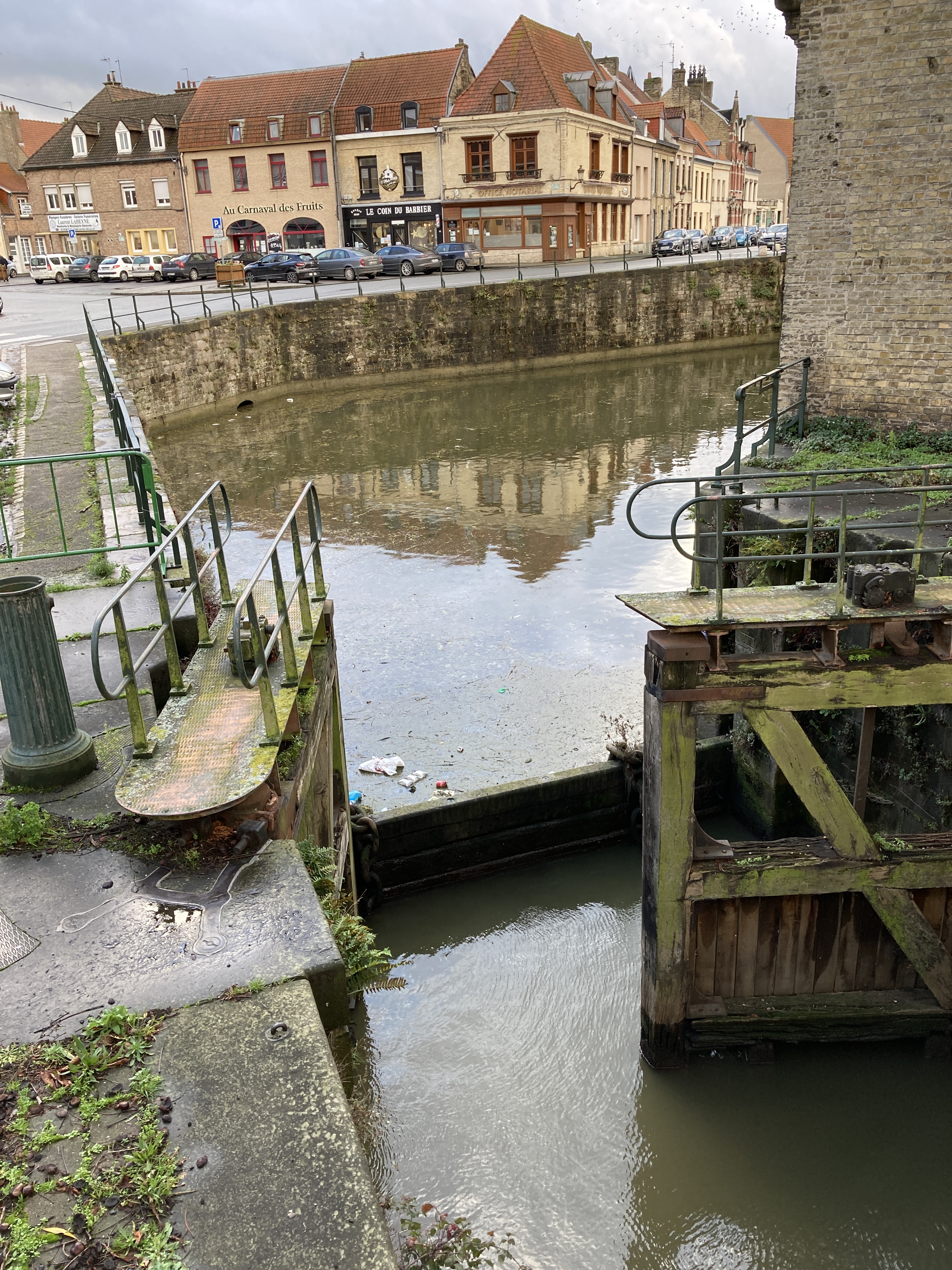 The Bergues croissant was the best croissant we have yet found in our northeast corner of France. The town itself was dreamy in a medieval way. We drove in through the Port de Cassel, parked, and walked toward the bell tower with its shining beacon of a lion on top. I was floored to discover a public toilettes, which literally does not exist in or around Brussels.