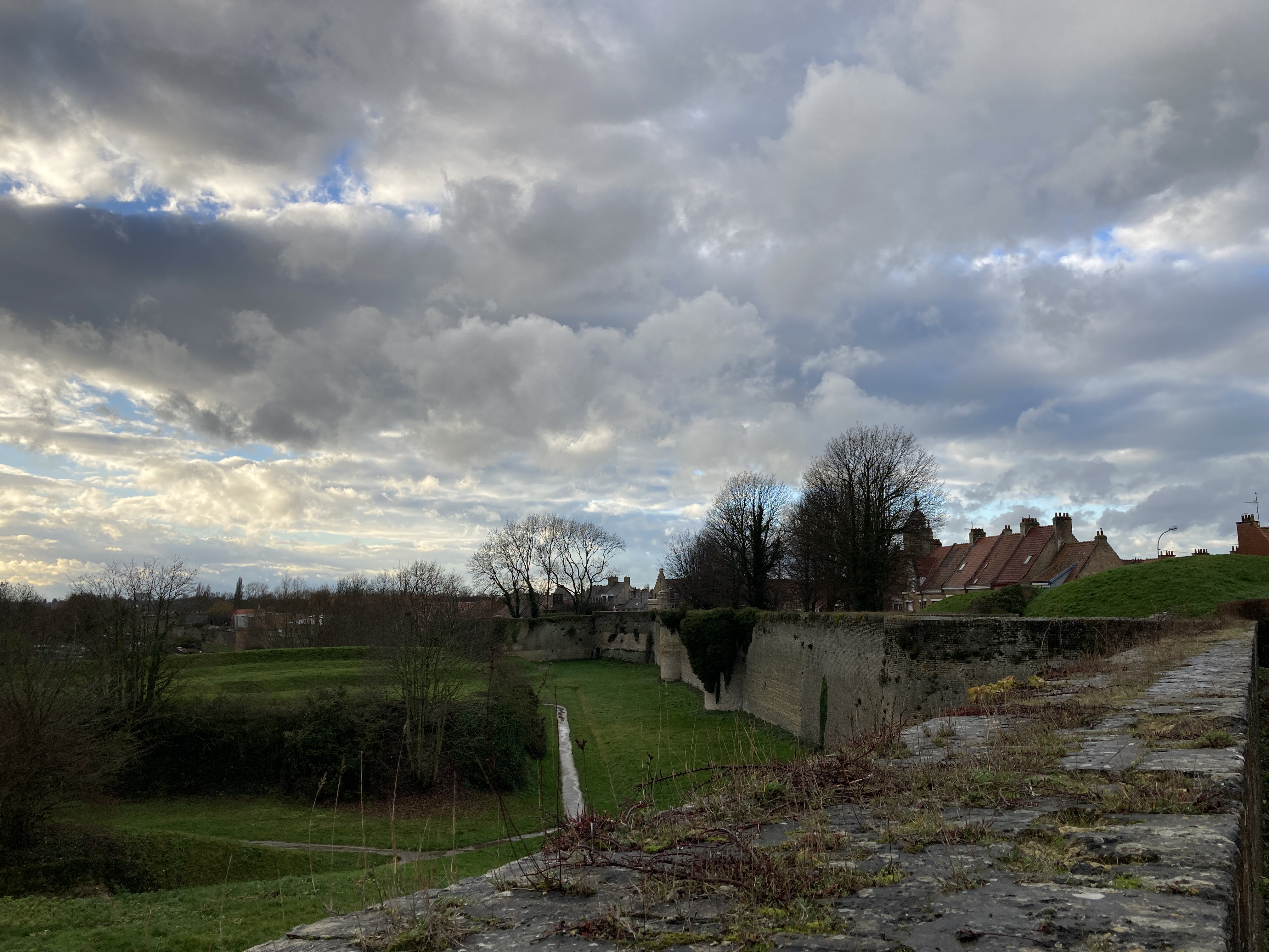 We carefully descended a slippery slope while the final gifts were being bestowed upon the ground and walked equally careful around said gifts as we made our way back into town. We walked past an ancient building and a memorial to the first and second world wars and toward an even more ancient rampart wall. This is one element of life in Europe that never ceases to amaze me. You can be walking down a busy city street and run pell-mell into a random castle. Granted, we were already walking around a medieval town so it should not come as a surprise that we should come across a medieval rampart wall, but still. Amazing.
