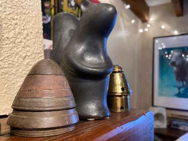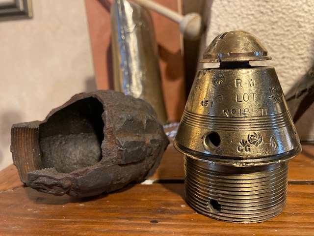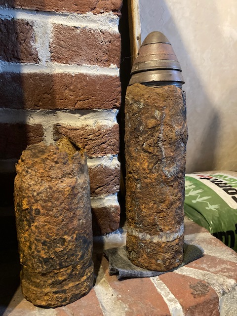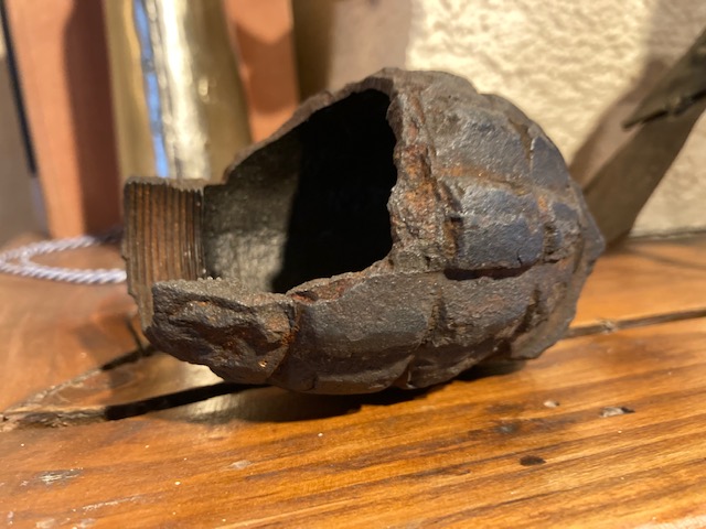 My husband brought it in, cleaned it up, and did some research online. He discovered that there was an actual department in France with the purpose of removing explosives from the countryside. This removal is referred to as the “Iron Harvest,” and it is an ongoing project to find and dispose of both unexploded ordnance (UXO or UO), unexploded bombs (UXBs) and explosive remnants of war (ERW). Each year, some 900 tons of live ordnance are removed.