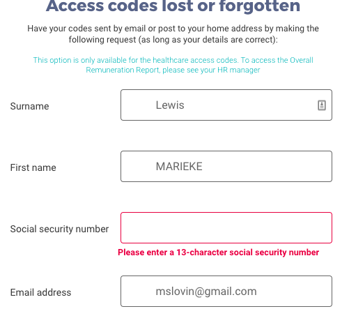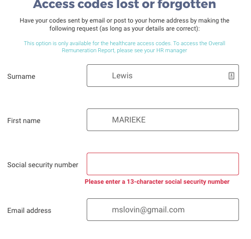 I next tried clicking on “Forgot/Lost codes” and was taken to a page where I could input First and Last Name, Social Security Number, and email address. I filled in the requisite information, and the website promptly responded that the number could only be 13 characters. My number was 15.