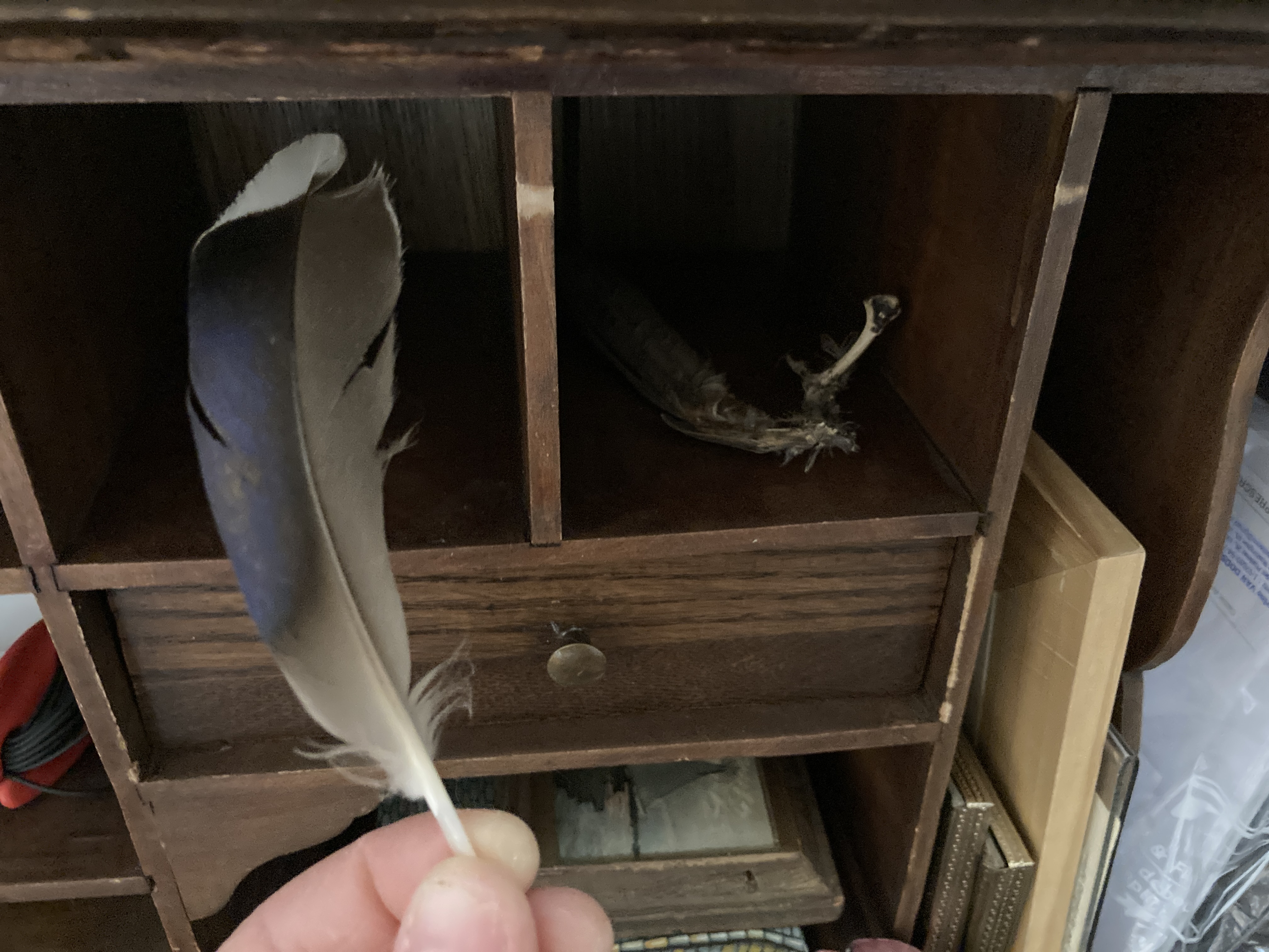 I am stepping into the life of someone I once knew who both exists and doesn’t exist. I am finding things from my four decades on this earth that show me how little I have changed. Collections of rocks, feathers, bones, marbles, shells, even teeth, as well as found objects that would be considered trash bound for the landfill to most people but that I placed lovingly in jars and/or plastic bags with labels in order to remember which were meant to stay together and where I had placed them around the house.