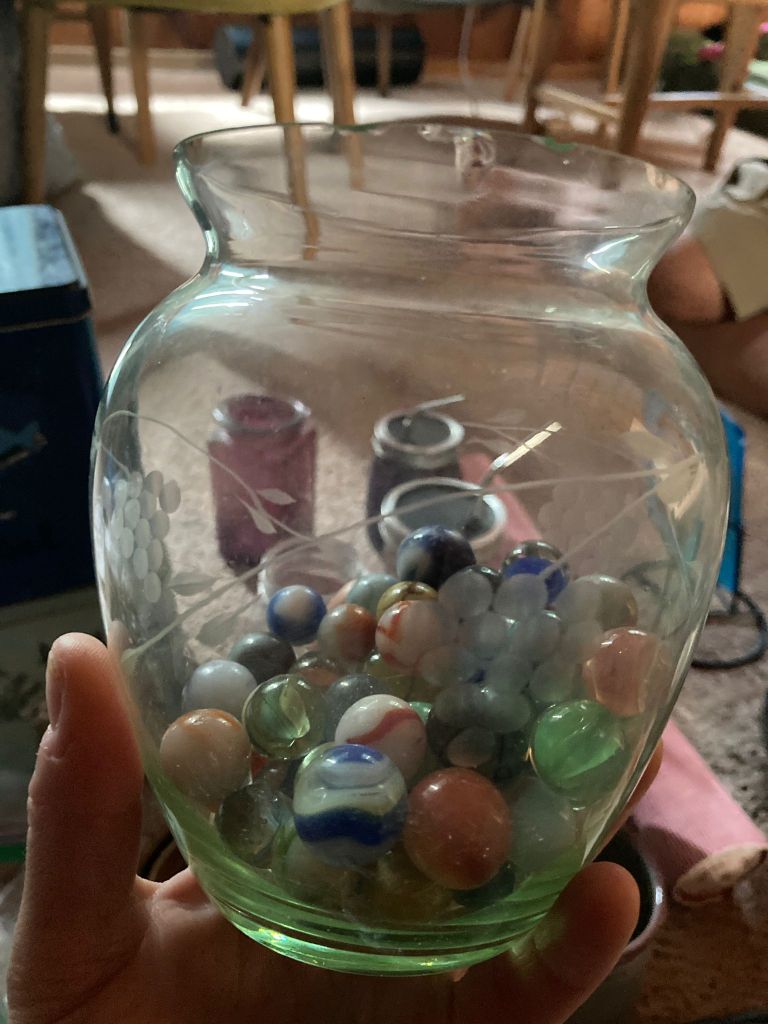 Upon rediscovering a jar full of marbles I think belonged to my dad when he was a child, I texted my husband, I found my marbles! I must not be insane after all.