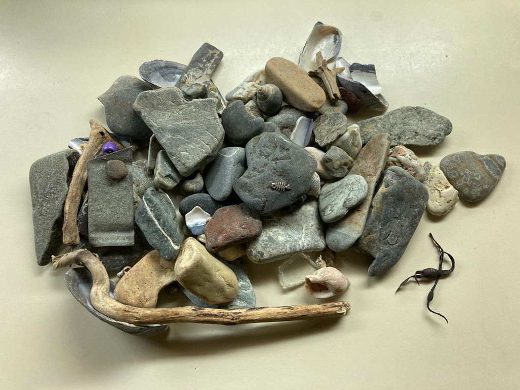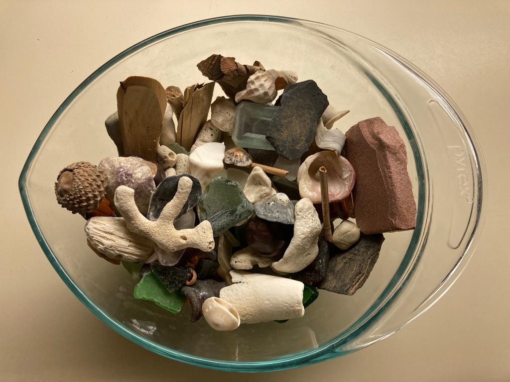 At one point, I emptied each jar of its contents, placing them into separate piles. I had already photographed each jar and the contents therein. I then photographed each pile and picked up each rock, feather, branch, shell, bone, and plastic or metal object in the mix. I tried to determine if any wanted to stay. I decided that I would set free any object that was more immediately fleeting. Acorns, tiny branches, feathers. I set them aside, some of them out on our back porch. Stones that wanted to continue on their journey I put into the pockets of a black canvas sack intended to transport bottles of wine from the grocery store to home.