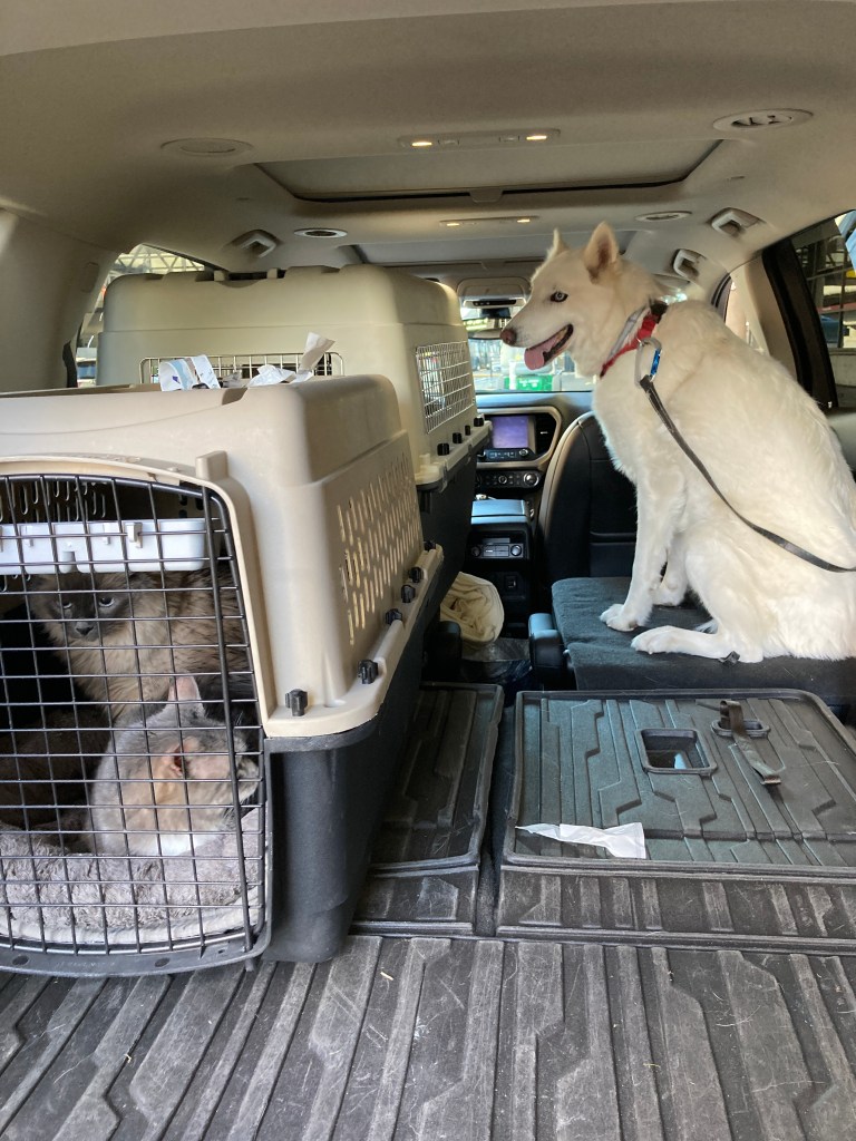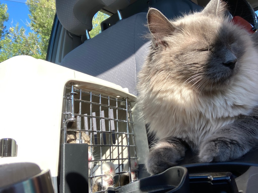 My road trip was even more stressful than I anticipated. I had packed three cats and dog into the car, along with my luggage, several musical instruments, and a cat litter box in the trunk. The barrier I had painstakingly placed between the back seat and the trunk to keep the dog from climbing back into the cat space lasted about 10 minutes. It worked to keep the dog out of the trunk, but I hadn’t anticipated that the cats would not stay back there. To be fair, it was advertised as a dog gate with nothing about how to keep cats from moving around.